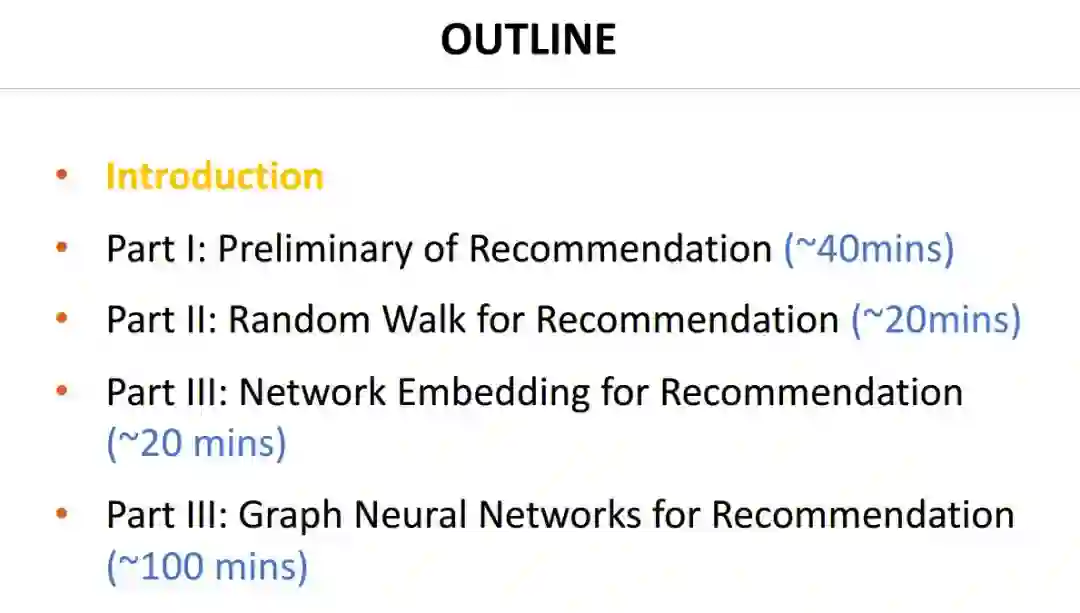在本教程中,我们将从图学习的角度重新讨论推荐问题。常用的推荐数据源可以组织成图,如用户-项目交互(二部图)、社交网络、项目知识图(异构图)等。这样一个基于图的组织将孤立的数据实例连接起来,从而为利用高阶连接带来好处,这些连接为协同过滤、基于内容的过滤、社会影响建模和知识感知推理编码了有意义的模式。随着最近图神经网络(GNNs)的成功,基于图的模型显示出其作为下一代推荐系统的技术潜力。本教程提供了基于图学习的回顾。