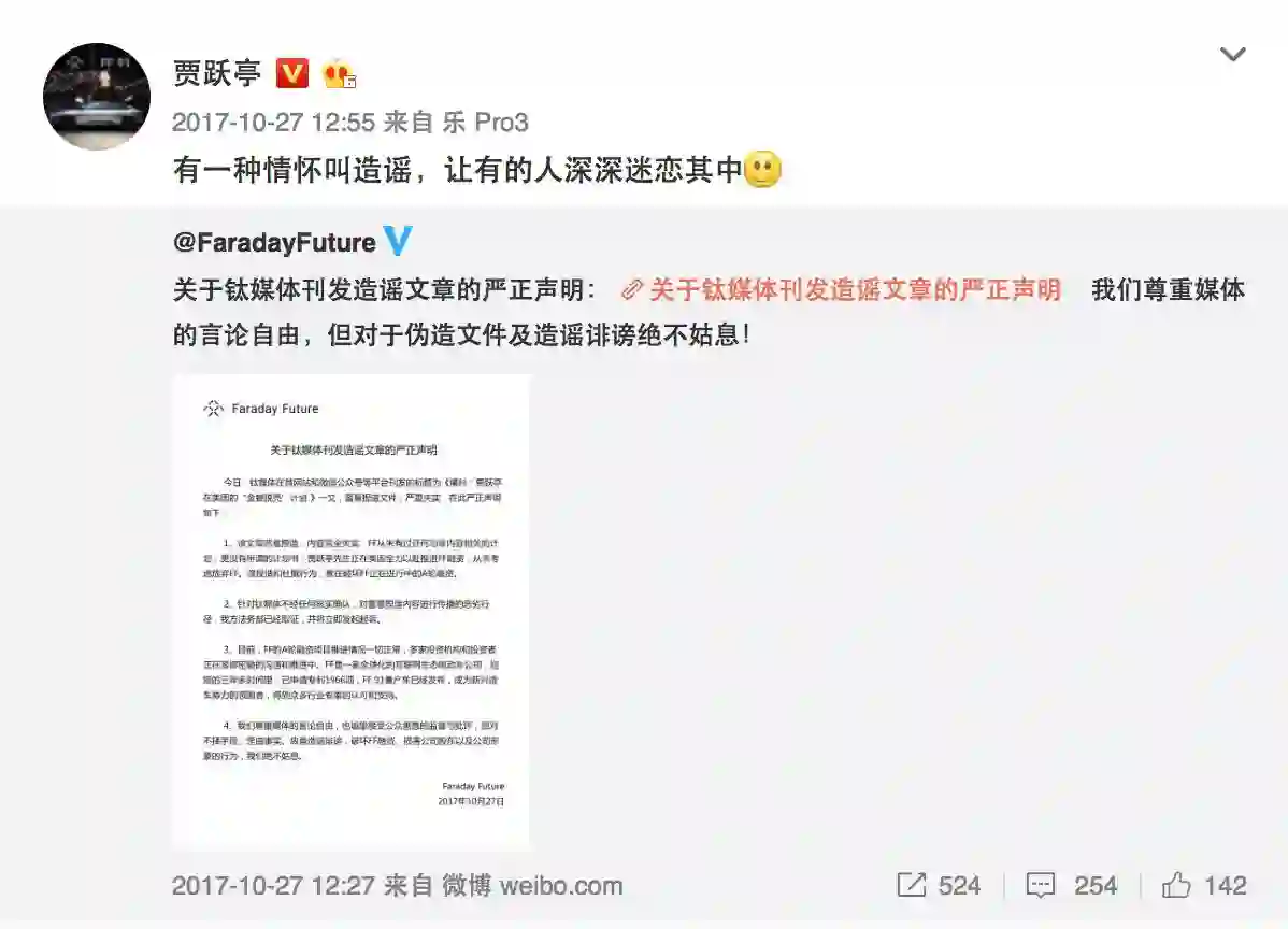 而10月底,他又卷入和钛媒体的口水中。钛媒体说他正对FF申请破产保护,想要完美脱身,文章以一位香港投资人的口吻写成。FF立即在微博上回应称:“严重失实。”