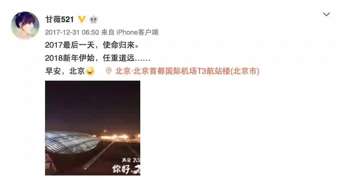 甘薇在2017年最后一天回到北京,她更新了一条微博,称自己使命归来,就像是这对夫妻向2018喊话:新年伊始,任重道远。那是这几个月来,她发出的唯一的一条微博。