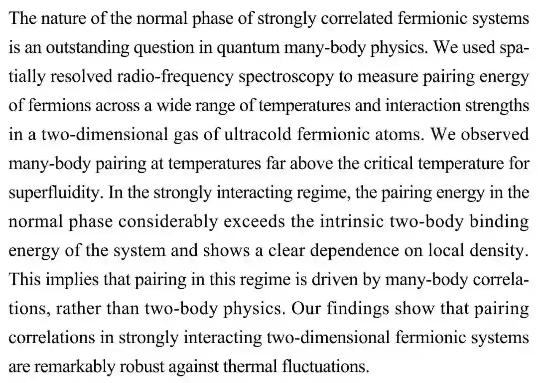 (导读 阿金)强相互作用费米系统的相位属性是量子多体物理学中的一个重要问题。本研究使用空间分辨射频光谱测量,在超过超流体临界温度以上观察到费米子多体配对现象。在超冷费米原子二维气体的强相互作用体系中,发现正常相位的配对能量明显超过系统内部双体结合能量,暗示了配对来源于多体互作用。