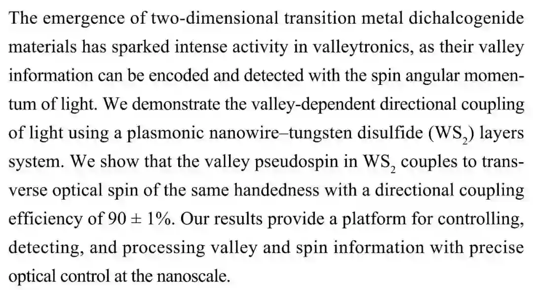 (导读 阿金)二维过渡金属双硫族化合物材料的能谷信息可以用光的自旋角动量编码并检测。本研究使用等离子纳米线-二硫化钨(WS2)层系统展示能谷依赖的光定向耦合。 WS2 中的谷赝自旋耦合相同手性的横向光子自旋,耦合效率达到 90 ± 1%。研究结果为调控、检测和处理电子能谷和自旋信息提供平台。