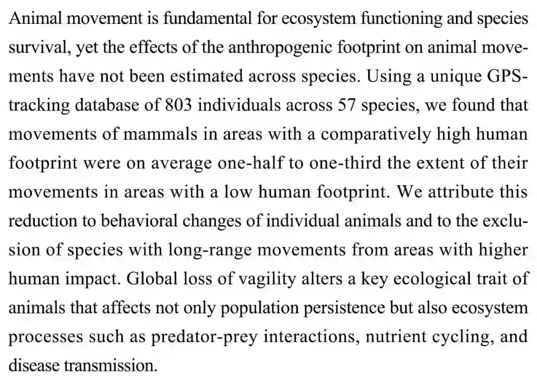 (导读 寒雨)动物活动是生态系统功能和物种生存的基础。本研究利用 57 个物种 803 个个体的独特 GPS 追踪数据,发现人类足迹相对集中地区比足迹稀少地区的动物活动平均减少至 1/2-1/3,这可能归因于人类活动导致的物种行为改变和长距离运动受限。此外,全球动物活动减少可能会广泛影响种群延续和生态进程。