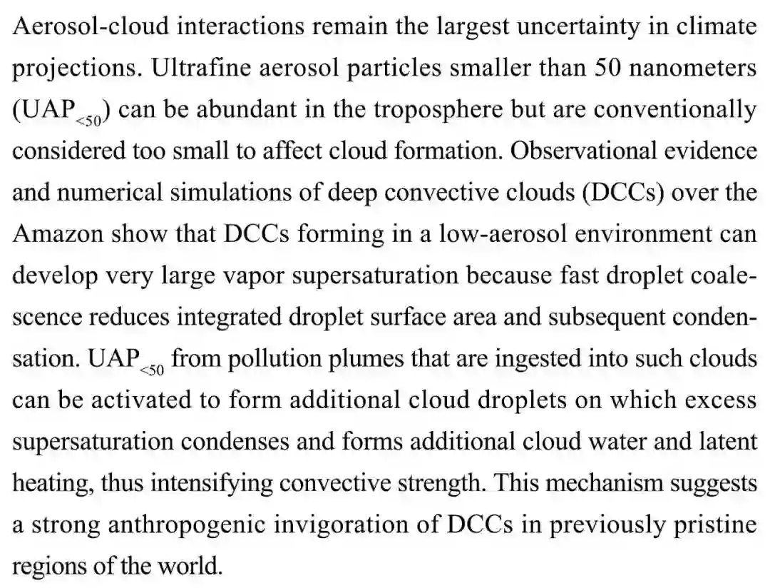 (导读 刘晓娟)一般认为富集在对流层的超细气溶胶粒子(UAP<50)不会影响云的形成。我们对亚马逊地区深对流云(DCCs)进行观测和模拟,表明在低气溶胶环境下 DCCs 形成过程易产生大量的过饱和水汽。污染羽流中的 UAP<50 能促进 DCCs 中微小云滴的形成,而云滴能够加速过饱和凝聚体、形成更多的云水和潜热,进而强化对流强度。这种机制表明人类活动能在 DCCs 形成中产生明显的增益效果。