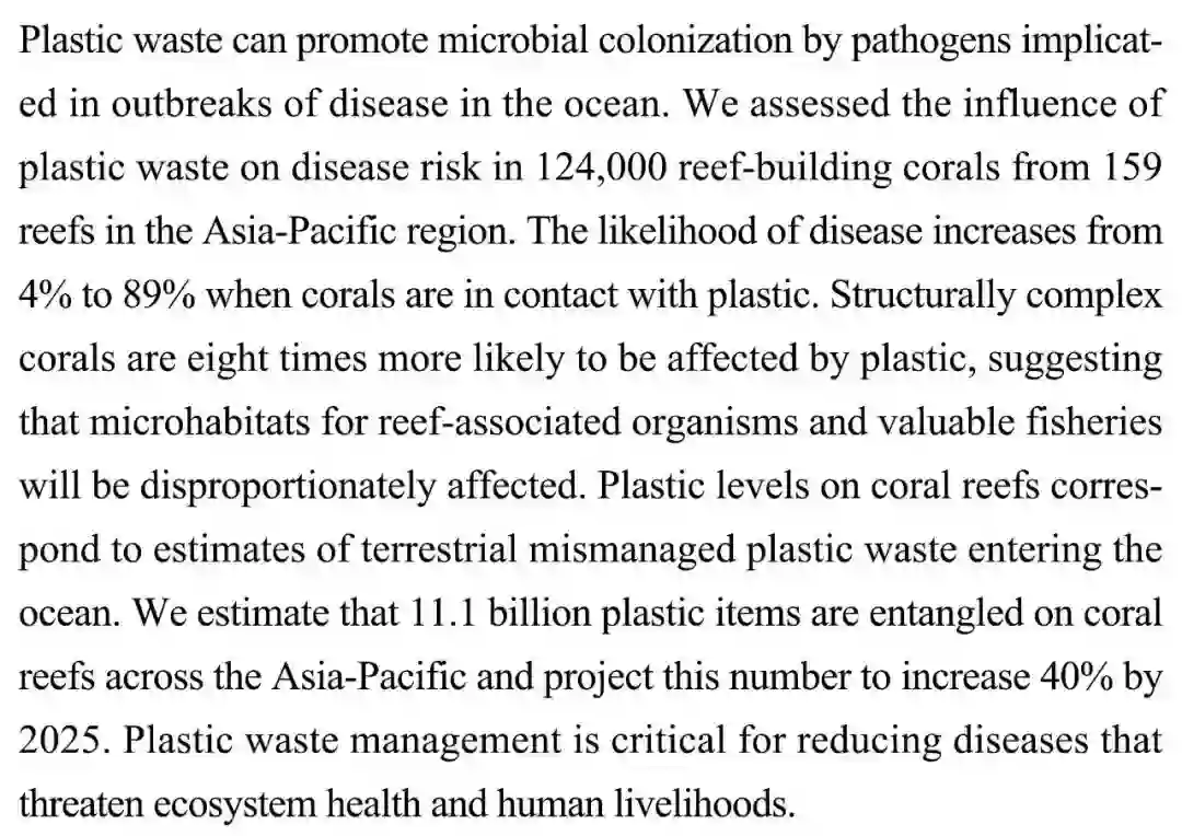 (导读 寒雨)保护珊瑚礁免受塑料废物影响已迫在眉睫。塑料废物可以促进与海洋疾病爆发相关的病原体微生物定植。本文以亚太地区 159 个珊瑚礁的 12.4 万只造礁珊瑚为研究对象,发现塑料废物导致珊瑚患病的可能性增加了 20 多倍,结构复杂的珊瑚受塑料影响的可能性增至 8 倍。珊瑚礁上的塑料来自处理不当的陆地塑料废物,预计到 2025 年,其数量将在 111 亿的基础上增加 40%。