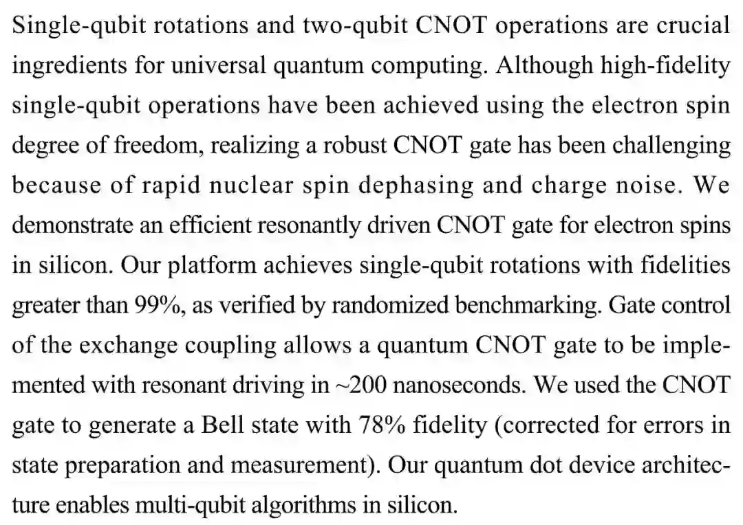 (导读 阿金)单量子位旋转和双量子位 CNOT 是量子计算的关键组成,但实现稳健 CNOT 门仍具挑战。本研究在硅中展示电子自旋谐振驱动的 CNOT 门,实现单个量子位旋转保真度大于 99%,交换耦合的门控则允许在 200 纳秒的谐振中执行一个量子 CNOT 门。该量子点器件有望于在硅中实现多量子位算法。