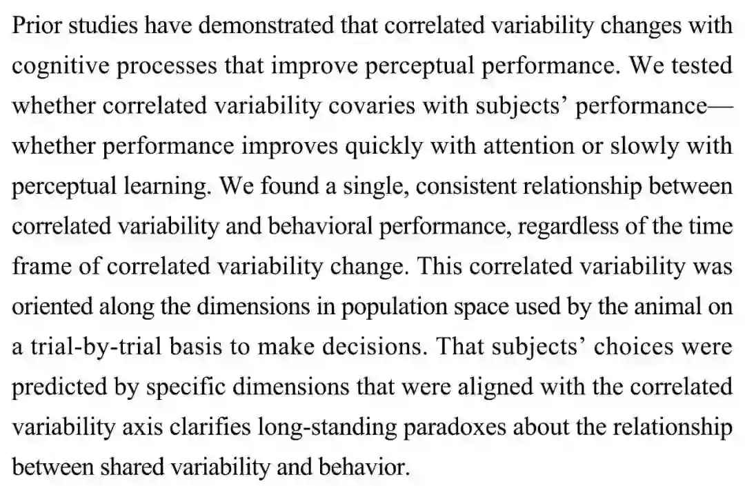 (导读 郭怿暄)曾有研究表明相关变异性会随着认知过程改变并提高认知表现。本研究试图探索相关变异性与被试主体表现是否存在共变,即认知表现会随着注意力迅速提高还是随着感知学习缓慢改善。结果显示不管时间范围,相关变异性和行为表现存在单一不变的关系。相关变异性与动物参与做出决定所运用的神经群体空间维度保持一致,研究主体的选择可由与相关变异性轴相一致的特定维度来预测。