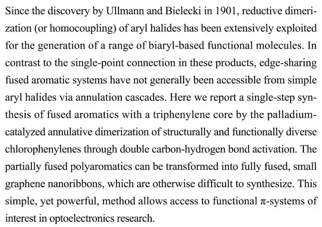 (导读 卓思琪)目前还没有利用芳卤反应生成稠环芳香系统的方法。本文报道了一个合成三亚苯为母核的芳稠环的一步反应。反应在钯催化下激活两个碳氢键的活性,使芳氯完成环化二聚反应。反应合成的部分稠合多环芳烃可以进一步转变为完全稠合多环芳烃。该反应对光电领域功能性 π 系统的研究有所助益。