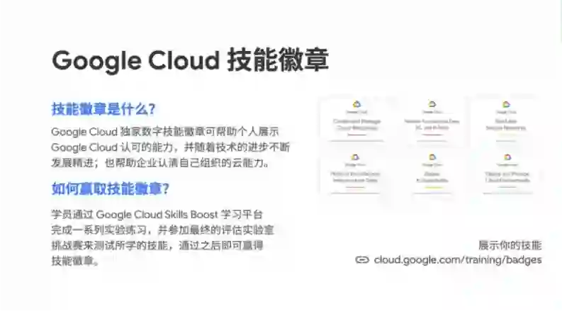 同时,Google Cloud 学习服务提供一系列学习路径和认证帮助开发者学习相关知识和技能。新的 Google Cloud Skills Boost 提供 700 多项实验、课程和认证备考资源。完成规定实验的开发者可以获得相应的 Google Cloud 技能徽章!
