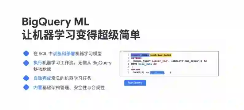 BigQuery 是伸缩能力极强且经济实惠的无服务器多云数据仓库。BigQuery Machine Learning (BQML) 是 Google Cloud BigQuery 独有的功能,使机器学习工作流实现大幅简化,以及让机器学习变得更简单。