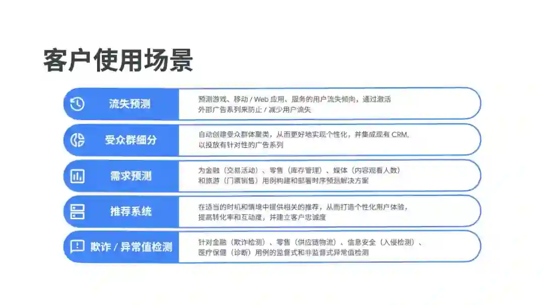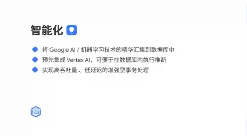 智能化:将 Google AI/ 机器学习技术的精华汇集到数据库中,并预先集成 Vertex AI,可便于在数据库内执行推断,实现高吞吐量、低延迟的增强型事务处理。
