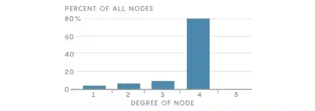 在我们的社交网络中,每个节点的度是每个人拥有朋友的数量。在 Regulartown 中,大多数人会有四个朋友,所以大多数节点的度数都为4。没有居民会有四个以上的朋友,但是有些人会有四个以下的朋友,于是会存在3、2或者1度的节点。