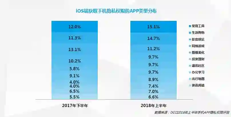 据评测发现,iOS 端获取手机隐私权限的 App 中,常用工具类、生活购物类和影音娱乐类 App 占比最大,分别占 15.1%、14.7% 和 11.2%。