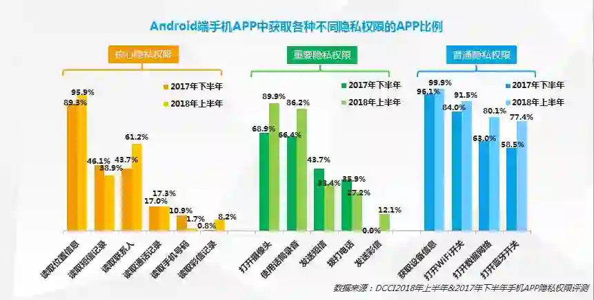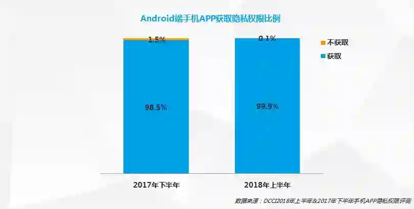 评测发现,2018 年上半年 Android 端获取隐私权限的手机 App 占比相较于 2017 年下半年提高了 1.4%,达到 99.9%,未获取隐私权限的手机 App 仅占 0.1%——几乎所有的 Android 端手机 App 都会获取隐私权限。