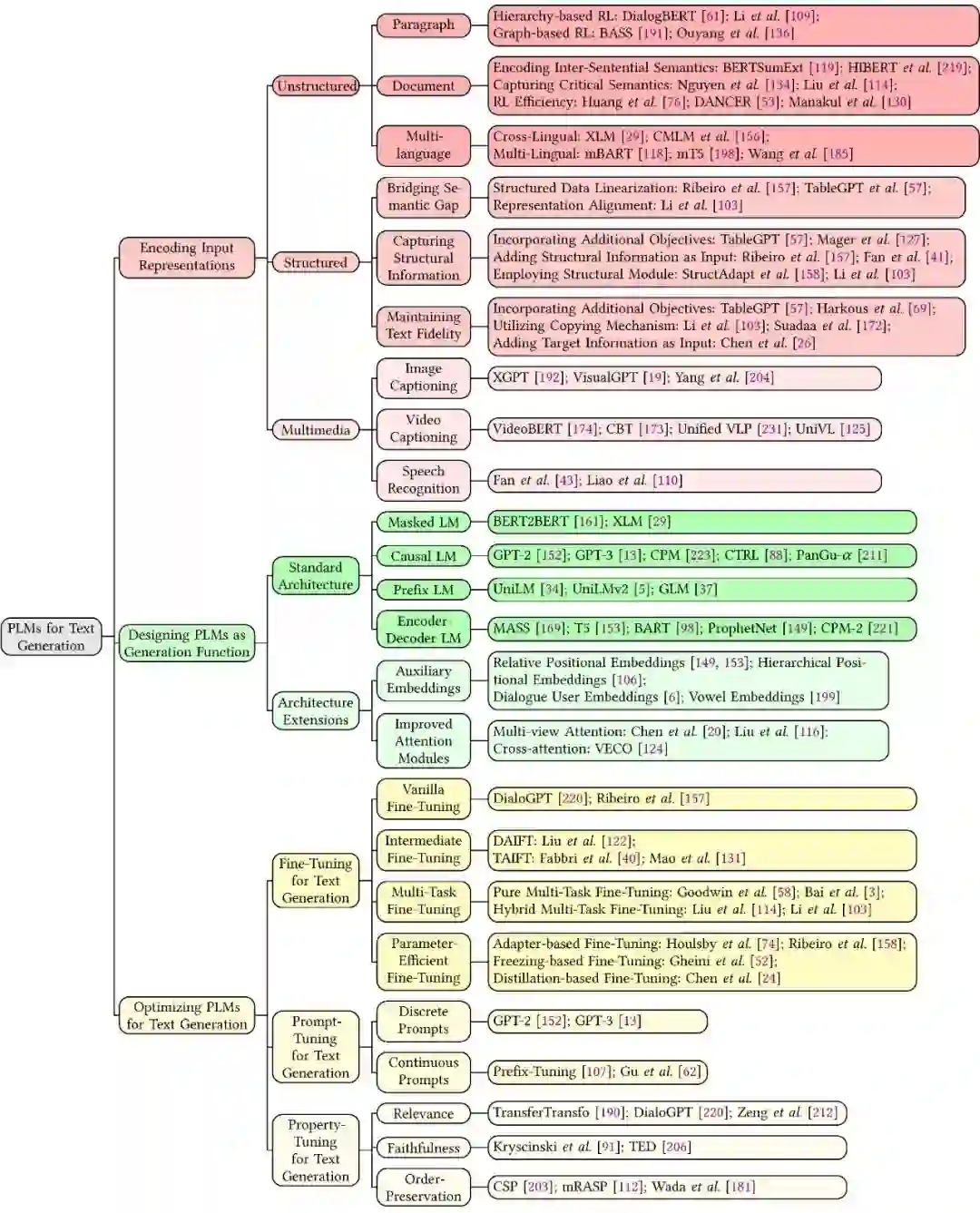 预训练语言模型技术解决文本生成任务主要考虑三个方面的挑战:1)如何有效地编码输入表示并保留其语义?本文第三章对输入数据的形态进行了划分,包括非结构化文本、结构化数据和多媒体数据,梳理了预训练语言模型针对不同类型输入的表示学习方法;2)如何设计有效的预训练语言模型作为生成函数?本文第四章介绍了四种预训练语言模型模式,包括Masked LM,Causal LM, Prefix LM和Encoder-Decoder LM,并在此基础上作出的拓展,例如增加额外的输入Embedding和Attention机制的创新;3)如何有效地优化预训练语言模型并保证输出文本满足某些语言属性?本文第五章介绍了三种针对文本生成任务的优化策略,包括传统的Fine-Tuning技术,新兴的Prompt-Tuning技术,以及针对特殊属性设计的Property-Tuning技术。