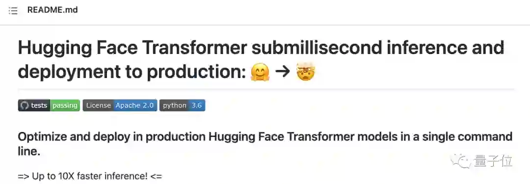 它可以用一行命令优化和部署Hugging Face上的Transformer模型,并支持大多数基于Transformer编码器的模型,比如Bert、Roberta、miniLM、Camembert、Albert、XLM-R、Distilbert等。