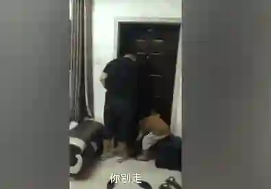 儿子堵在门口哭着撒娇不让爸爸坐电梯离开,爸爸只能看着儿子哭闹,说不出一句话。