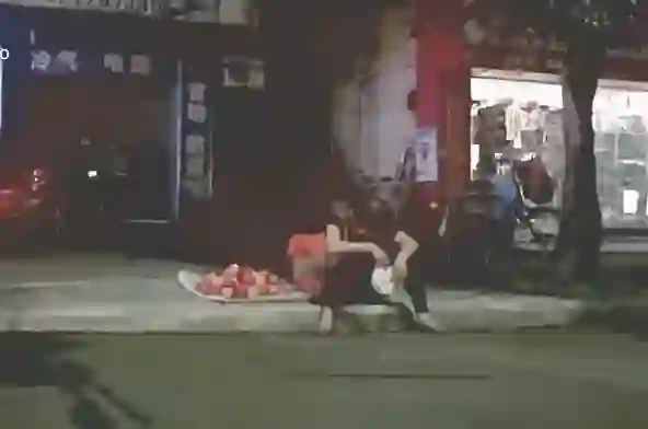 广东佛山,一位大妈晚上坐在路边睡着了。