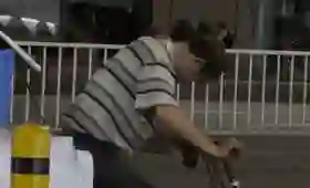 他步伐缓慢、一瘸一拐,靠骑小三轮载客为生。