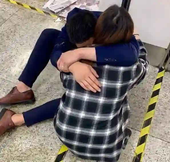 终于等到妻子赶来,一直努力让自己情绪稳定的男子,一把抱住她,边哭边说: