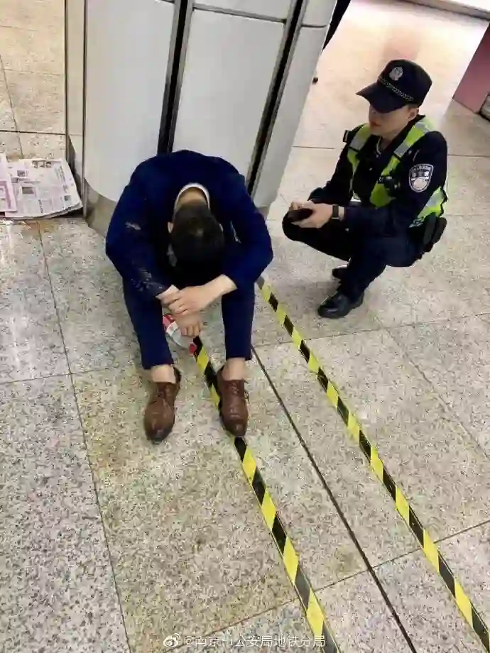 4月17日深夜,一名西装革履的男子醉倒在地铁站。