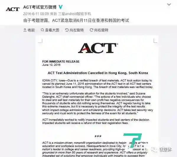 @ACT考试官方微博 上至今还保留了这一通知。“由于考题泄露,ACT紧急取消6月11日在香港和韩国的考试。”