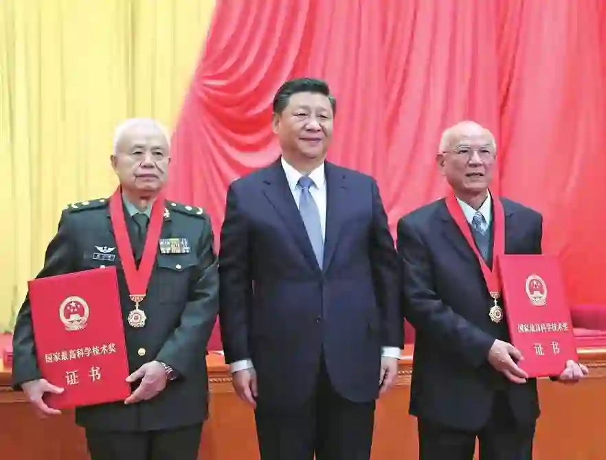 2019年1月8日,中共中央总书记、国家主席、中央军委主席习近平向获得2018年度国家最高科学技术奖的哈尔滨工业大学刘永坦院士(右)和中国人民解放军陆军工程大学钱七虎院士(左)颁奖。 (图片来源:新华社)
