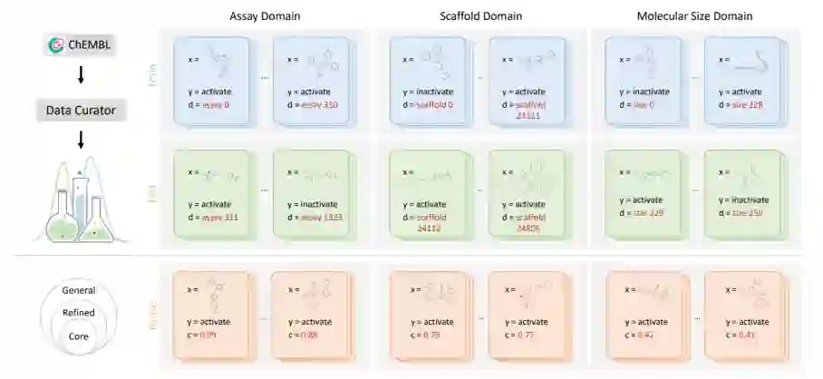 。5 种域标定方法(scaffold、assay、molecule size、protein、protein family)能够反映药物 AI 中真实的分布偏移场景;3 种噪声标定水平(core、refined、general)根据测量置信度,度量标准,截断噪声等来制定,能够锚定数据中不同的噪声水平。