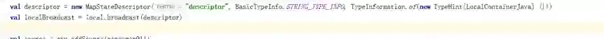 其次,定义MapStateDescriptor描述符,并把转换的表数据对象流广播出去,描述符必须和表数据对象流格式相对应。