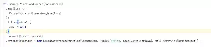 然后,使用connect将BroadcastStream 与Kafka传来的数据流合并,因为这两种流数据类型不同,所以使用connect多流合并,返回BroadcastConnectedStream。Flink的多流合并还有union和join等,union要求连接的流数据类型必须一致,join则要求每个流必须有key且key值相同才能完成关联操作。之后调用Process方法分别对各流做具体逻辑操作。因为我们的场景并不需要对数据集做Key分区,所以在Process方法里传入抽象类BroadcastProcessFunction的参数实现。