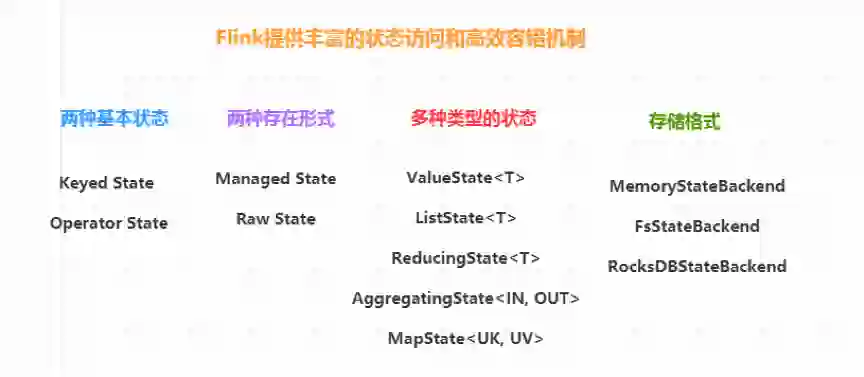 不仅有Broadcast State,根据数据集是否按照Key分区,Flink可以将状态分为Keyed State和Operator State(No-Keyed State)两种类型,而这两种状态类型又均具有两种形式,分别是托管状态(Managed State)和原生状态(Raw State)。区别在于托管状态(Managed State)是由Flink Runtime控制和管理的状态数据,并将状态数据转化存储在Java Heap内存的Hash Table或RocksDB,然后将这些状态数据通过内部的CheckpointedFunction接口持久化到Checkpoints中,而状态的一致性,其实也是通过Checkpoints实现。因为有第三方RocksDB数据库的参与,可以把State数据暂存RocksDB数据库中,相比存于Java Heap中更安全。如果开启Checkpoint增量机制,新产生的数据会替换之前产生的文件COPY到持久化中,以此减少COPY的数据量,并提高性能,更适合在生产环境使用。但目前为止,RocksDB还不支持Broadcast State。