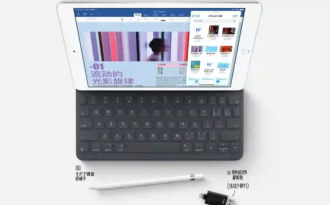 这次入门版的iPad最大的升级改变就是屏幕从9.7英寸升级至10.2英寸。并且支持了全尺寸智能键盘,配合iPadOS使用,比以往更加实用。