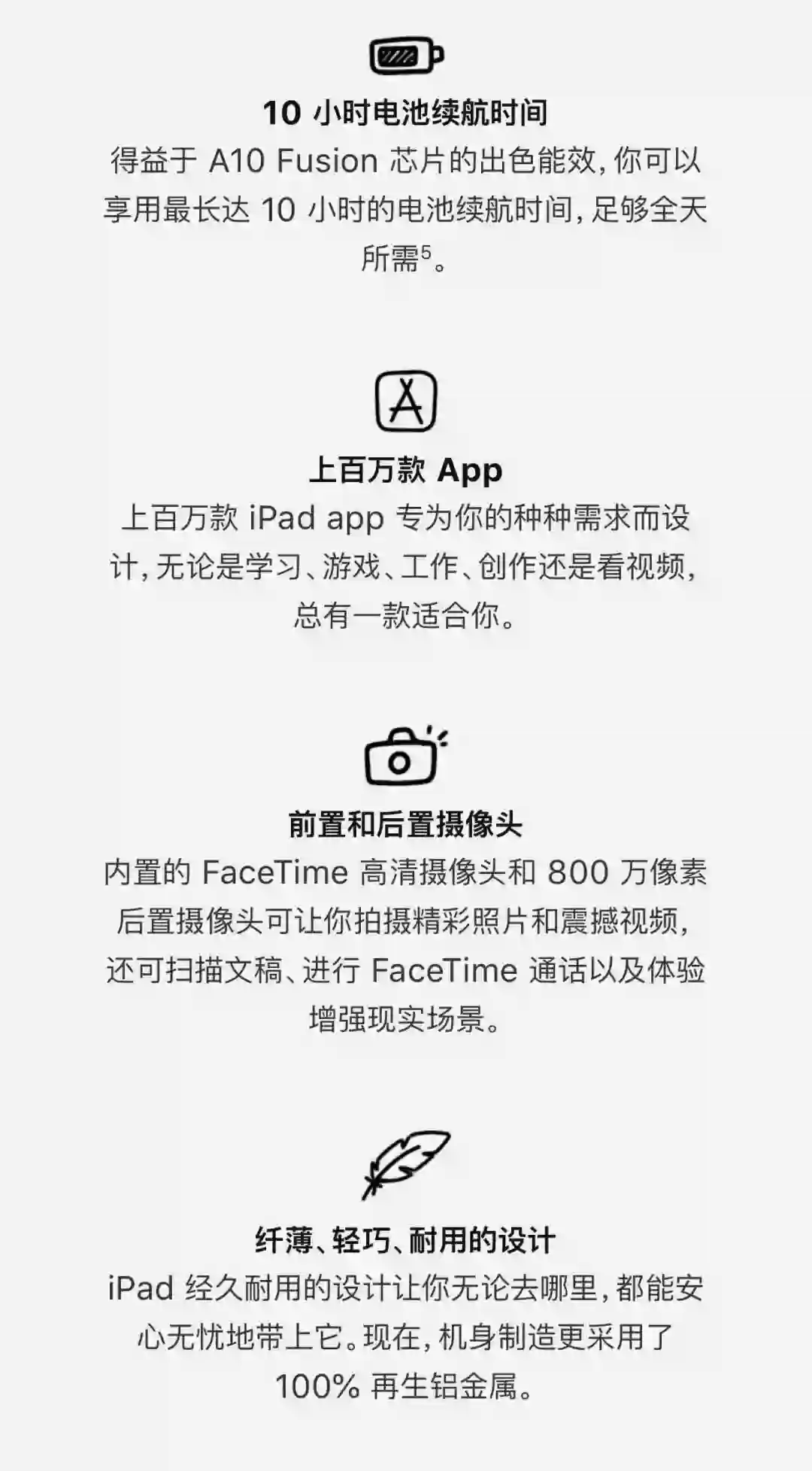 后置摄像头为800万像素,材质上,新iPad的机身采用了100%的再生回收铝金属打造。