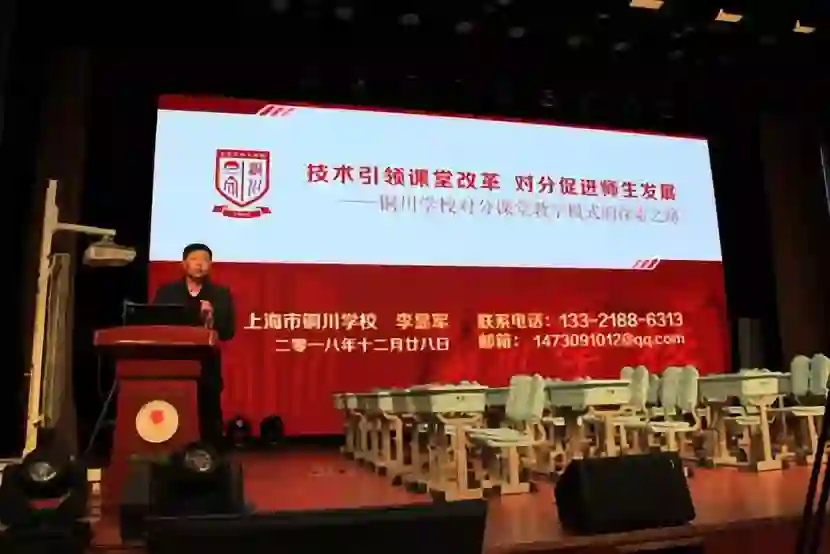 公开课后,上海铜川学校李显军副校长做《技术引领课堂改革 对分促进师生发展》的发言,系统介绍该校在学校层面实践对分课堂的方法和成果。铜川学校在上海市普陀区教育局“调结构、强技术、重文化”基础上,提出“调课堂结构、强对分技术、重本草文化”的具体实施理念。2015年开始引入对分课堂,通过讲座学习、资源共享和培训督导的方式,全校11门学科实践对分,定期研讨、总结经验,取得良好效果。