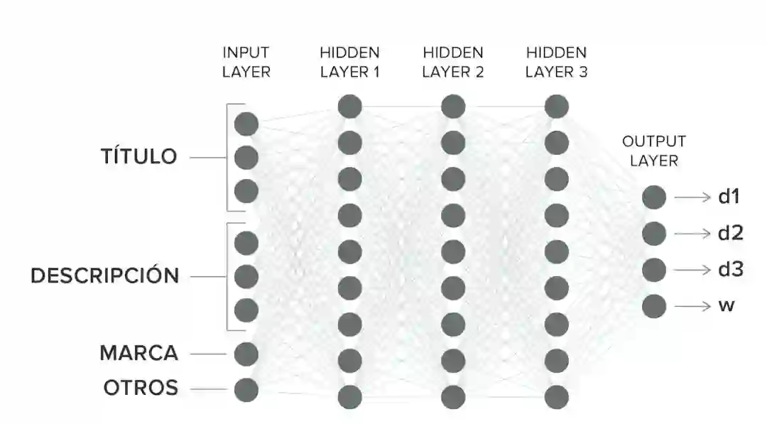 因此我们需要建立回归模型,以便通过产品名称、描述、类别和一些其他属性等信息推测产品的尺寸和重量。重要的是,这些属性既包括结构化数据,也包括非结构化数据,因此我们很难使用传统统计方法构建模型。该模型在 1 分钟内预测并保存 3000 个结果(一天 400 万次),其 API 每分钟响应 20 万次请求(一天 2.88 亿次,主要为预保存请求)。