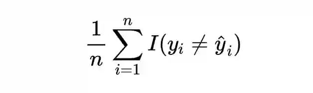 上文提到回归问题中利用 test MSE 来衡量模型好坏,对于分类问题,也有一个类似的衡量指标:误分类率 (error rate)。可写为以下形式: