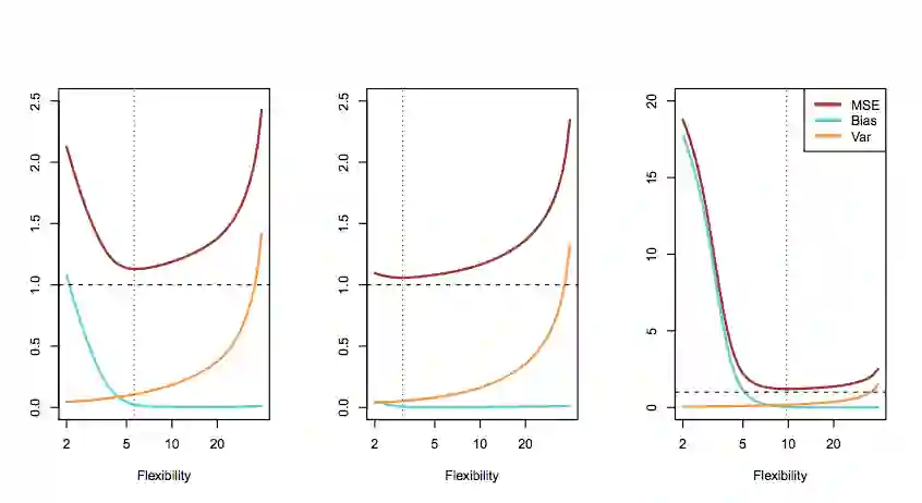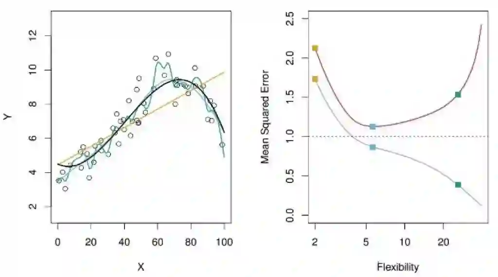 此外,在右图中,我们发现红色所代表的 test MSE 出现了一个典型的先降后升的“U型”趋势图,然而灰色所代表的 train MSE 则是一路下降。换句话说,随着模型 flexibility 的提升,train MSE 不断下降,这很容易理解,因为模型 flexibility 不断提升的过程中在不断的贴近训练集中的数据。而作为我们衡量模型好坏的标准,test MSE 先降后升,说明模型 flexibility 不是越高越好。模型 flexibility 不断提升的过程中,到底发生了什么?