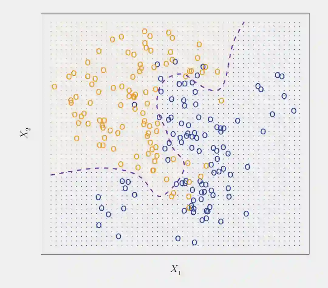 考虑到贝叶斯分类器的特点,理论上我们总是想用它来做分类任务。但是在真实数据集中,对于给定的样本 x,其所属类 Y 的条件分布是不可知的。所以贝叶斯分类器对我们而言是一个无法达到的标准,很多分类器也是通过根据训练数据估计以上条件分布来对样本进行分类的。一个很简单的例子就是 K 近邻法(KNN),在 KNN 中,可以通过调整 K 值来调整模型的 flexibility,K 值较大时模型 flexibility 较小,而 K 值较小时模型 flexibility 较大。选择合适的K值可以达到接近(略低于)贝叶斯分类器的分类效果。