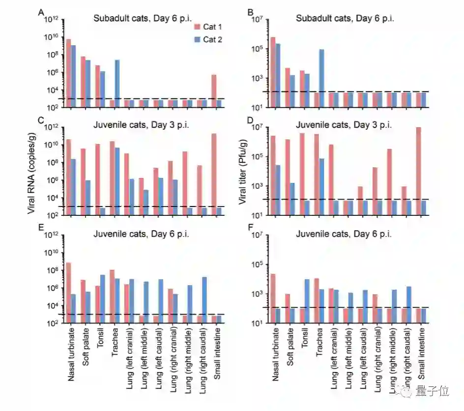 在6天后安乐死的两只亚成年猫身上,其鼻甲骨、软腭和扁桃体,其中一只猫的气管和另一只猫的小肠中检测到了病毒RNA。不过,在它们的肺部样本中均未检测到病毒RNA。