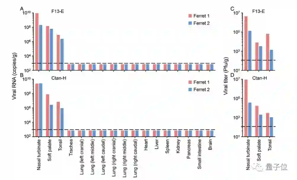 研究人员在这4只雪貂的鼻甲骨、软腭和扁桃体中均检测到了病毒RNA和具有传染力的病毒,但在其他器官中未检测到。