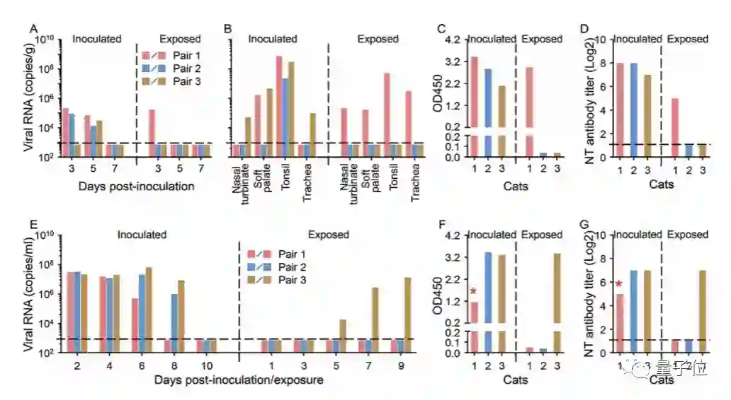 实验第 3 天,有一只暴露的猫粪便中检测到了病毒RNA。在第 11 天对其实施安乐死之后,在这只猫的鼻甲骨、软腭、扁桃体和气管中均检出病毒RNA。