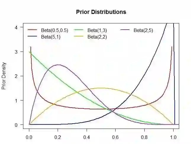 对贝叶斯人来说,我们在一进入赌场就对每台老虎机扔钱的概率 p_i 就有一个先验分布(prior distribution)的假设了,比如一个很常见的我们可以用Beta分布。如果我们认为大概率 p_i 都应该是0.5,即对半开,而不太可能出现一些很极端的情况,我们就可以选择Beta(1,1)分布作为我们的先验分布。然后在我们真正摇了老虎机之后,根据相应的反馈,我们就可以调整 p_i 们相应的后验分布(posterior distribution)。