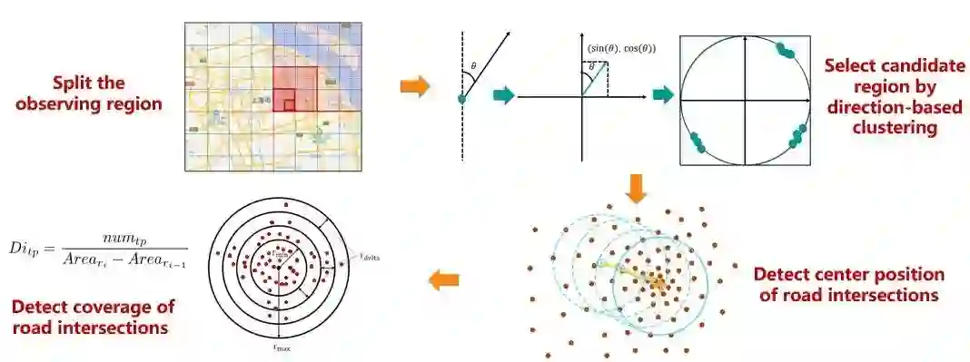 为了检测道路交叉口影响区内的详细拓扑信息,首先需要识别道路交叉口的核心区域,即路口位置和覆盖范围。考虑到不同路口大小不一,并且路口范围内轨迹通常具有减速、转向等特征,我们设计了一套基于四叉树空间划分和Mean-shift的自适应路口位置检测算法。在搜索道路交叉口单元的过程中,将四叉树的最小边长设置为25米,并从200米大小边长开始的层(即从四叉树底部开始的第四层)搜索道路交叉口单元。由于交叉口中心位置的轨迹往往比路段具有更多的转向与较低的转速,我们对每个网格单元中的所有特征点(轨迹压缩获得)执行速度分析和基于方向的DBSCAN聚类,筛选潜在的道路交叉口网格单元。随后,我们提出了基于方向的聚类算法识别路口的中心位置。