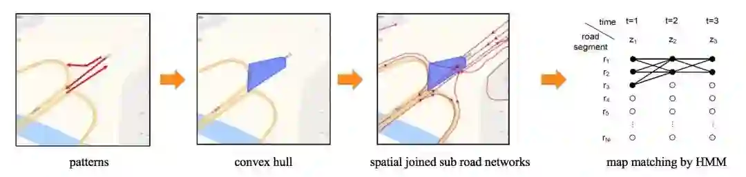 在获得转向路径后,我们采用经典的HMM算法结合基准路网进行地图匹配。为加速匹配过程,我们基于每个路口的转向路径集生成凸包再与路网空间关联。