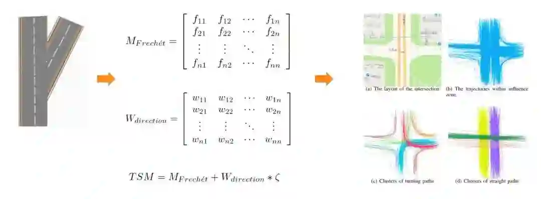 Frechét距离适于评测曲线之间的相似性,但是对于复杂形状的路口以及路口邻接路段间朝向偏差较小的情况,Frechét表现不佳。鉴于此,我们将方向权重引入相似性评测中。对于任意两条轨迹序列,分别计算起点与终点间的方向差,并结合Frechét距离生成轨迹集合的距离矩阵。基于该矩阵结合DBSCAN聚类实现路口范围内的转向簇提取。