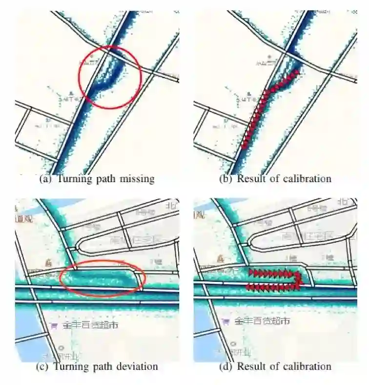 在影响区拓扑结构的校准阶段,我们基于检测的路口中心位置和核心区范围向外扩展,根据预设的半径阈值获得影响区的范围,同时获取交叉路口影响区内的全部轨迹。我们对这些轨迹进行转向簇提取与中心线拟合,并将拟合的转向路径与基准路网进行地图匹配。