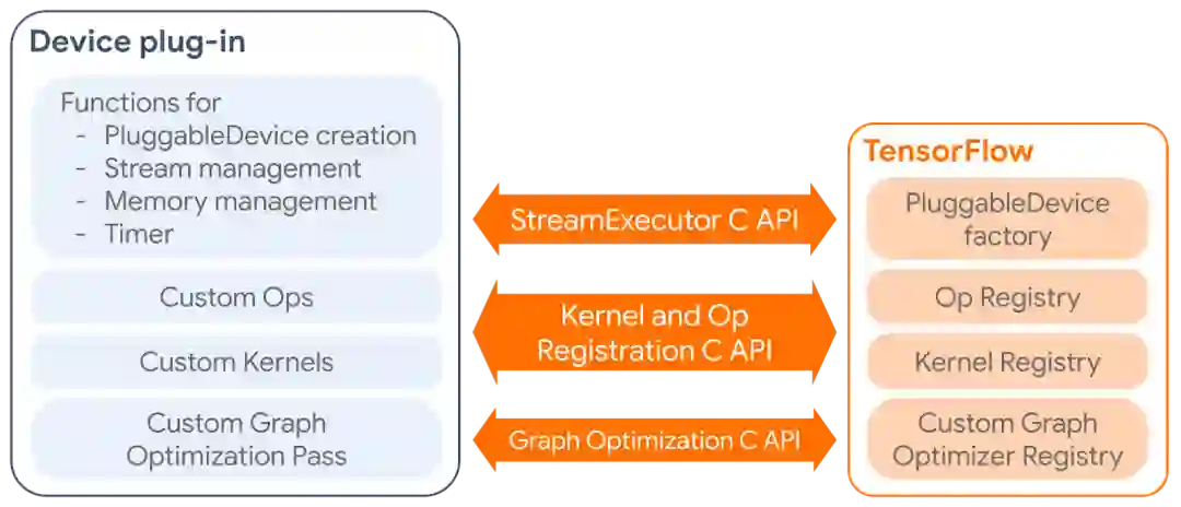 PluggableDevice 架构已在 TensorFlow 社区内完成了协同设计和开发。此架构利用了我们在 Modular TensorFlow 方面取得的进展,并且使用 StreamExecutor C API 构建而成。PluggableDevice 机制在 TensorFlow 2.5 中可以使用。