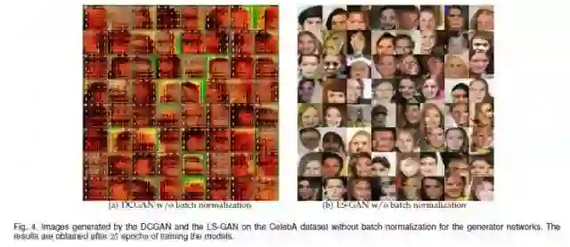 如果我们把DCGAN和LS-GAN中Batch Normalization 层都去掉,我们可以看到DCGAN模型崩溃,而LS-GAN仍然可以得到非常好的合成效果: