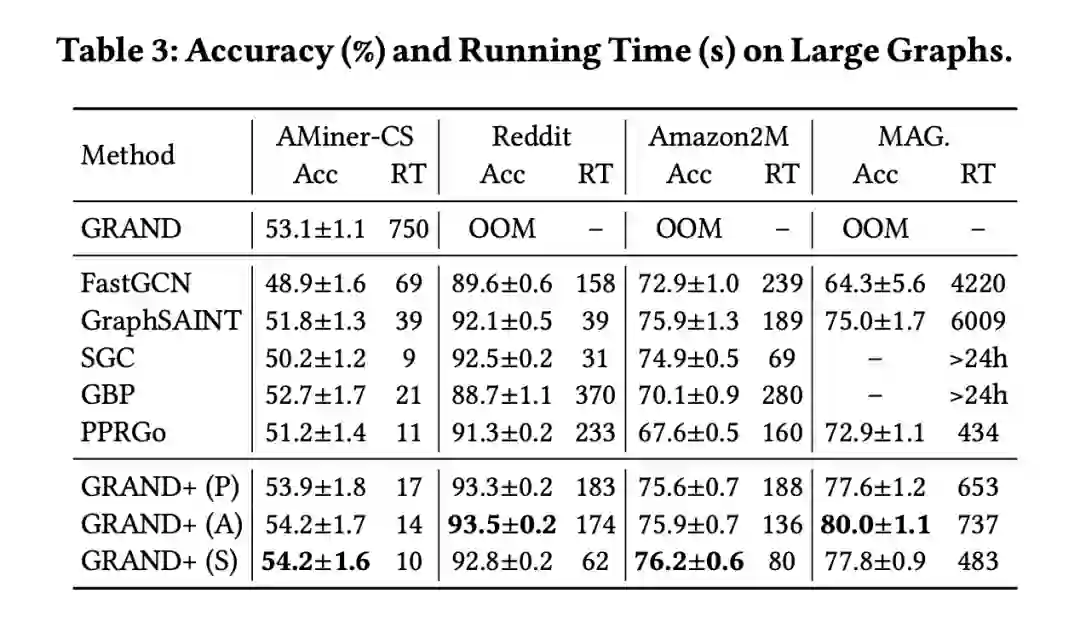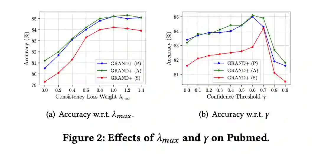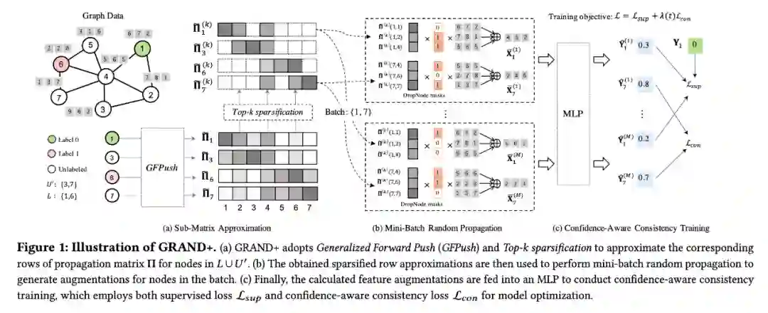 近期的工作认为图随机神经网络具有很好的性能,但是难以用在大型图上。本文提出了一个广义的前推算法,预先计算传播矩阵,并使用它以小批量方式执行图数据扩充,最后使用一个自信感知的一致性损失来优化模型。