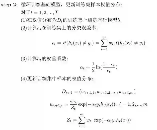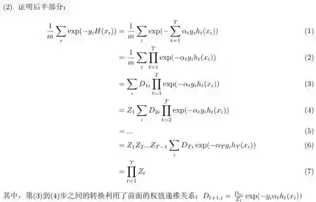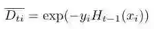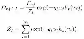 这便得到了基础模型的组合系数,再回头看每轮提升过程中样本权值的更新过程: