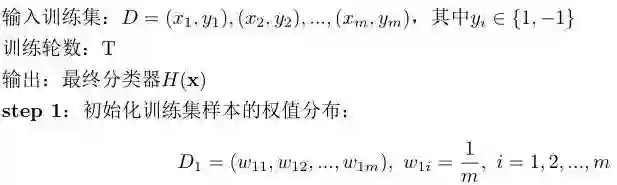 第1行初始化样本权重,m表示样本总数。
